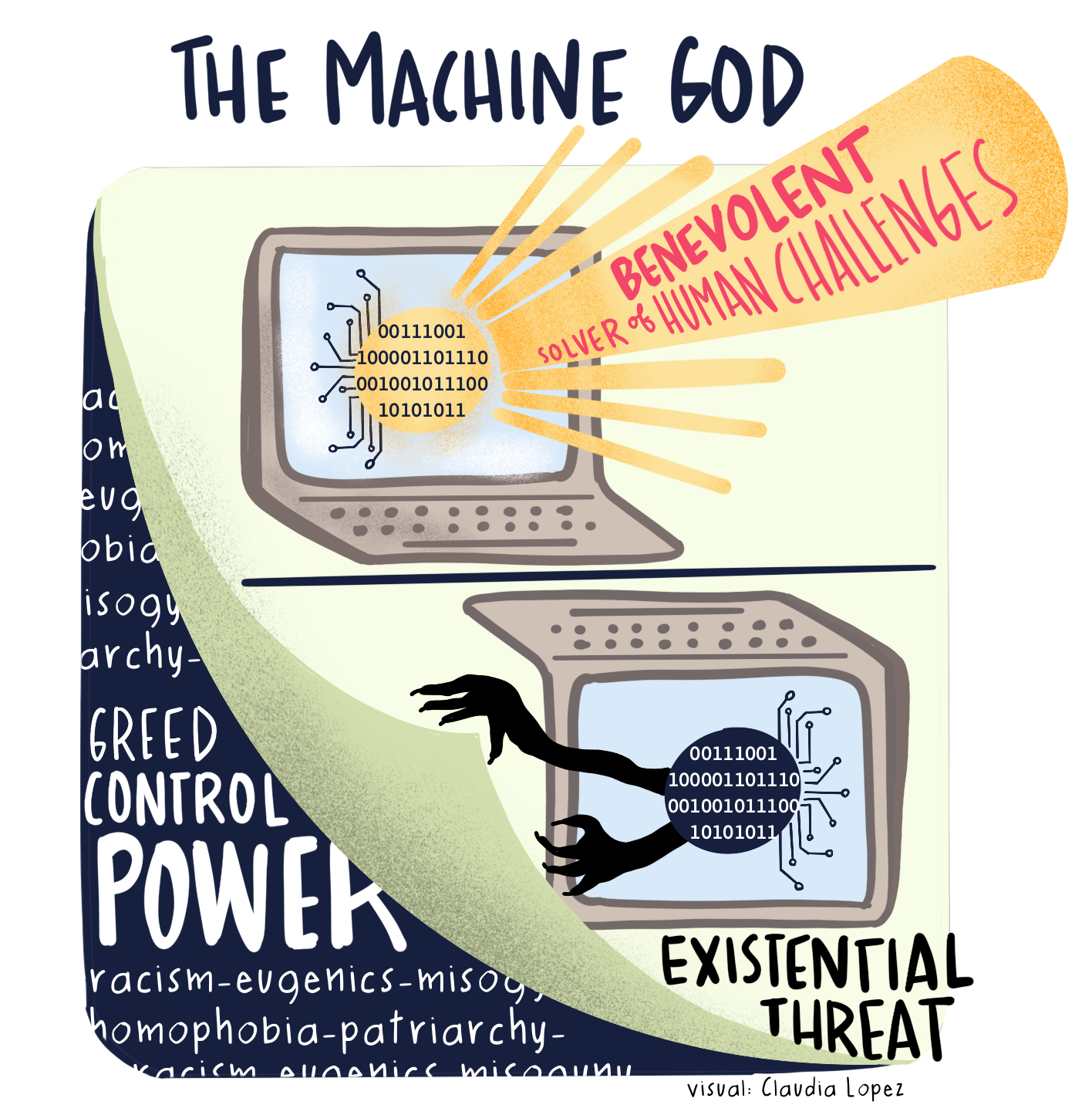 This astute portrayal reveals a continuation of old power dynamics manifesting in new technologies, driven by profit motives and an insatiable desire for control. It positions a group of predominantly white men, often holding patriarchal, homophobic, racist, and eugenic ideologies, as the rightful developers and controllers of these technologies. Who argue for less regulation and bureaucracy, and push for the construction of massive data centers that exploit workers and degrade the environment, often in the Global South and with little accountability.