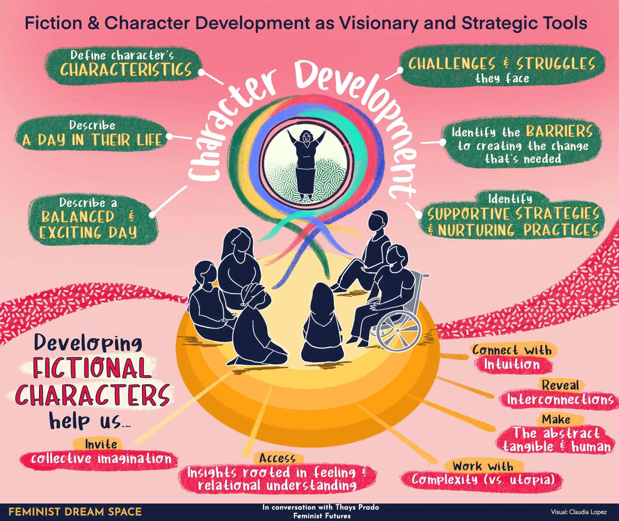 Developing fictional characters is a futures tool that help us: connect with our intuition, invite collective imagination, reveal interconnections, access insights rooted in feeling and relational understanding (not just logic) and work with complexity, as characters make abstract issues tangible and human.
